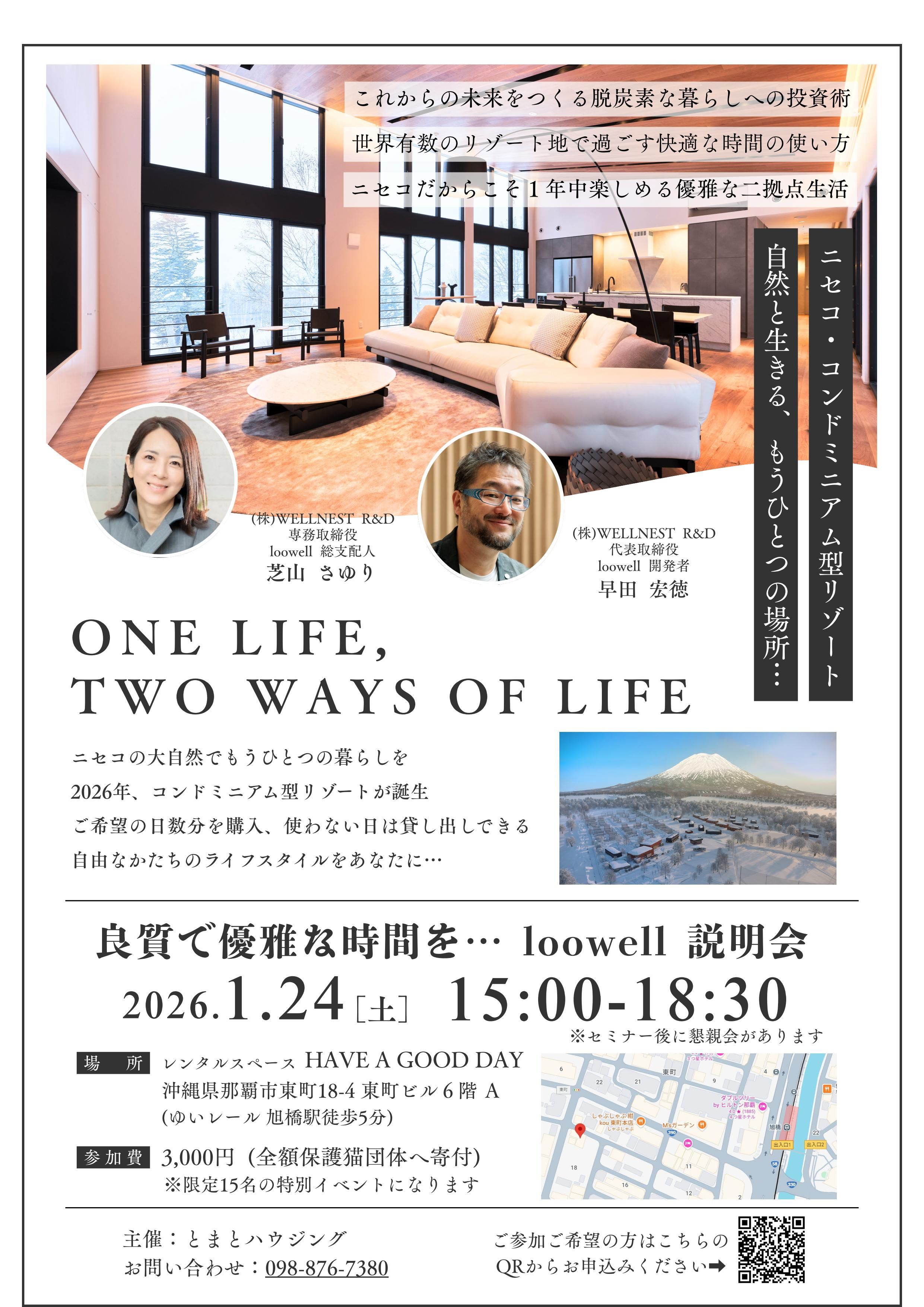 <p>脱炭素な暮らしを兼ね備えたニセコとの二拠点生活への投資術を、</p><p>loowell開発者 早田 宏徳氏・総支配人 芝山 さゆり氏をお招きして</p><p>いろいろ教えてもらおうじゃないか!企画。</p><p> </p><p>「脱炭素な暮らしとは」</p><p>「コンドミニアム型リゾートとは」</p><p>「ニセコってどんなとこ」</p><p> </p><p>ニセコのコンドミニアム型リゾートを通して『脱炭素な暮らしへの投資術』が学べます</p><p>自由なかたちのライフスタイルにご興味がある方へおすすめいたします</p><p> </p><p>【講師】</p><p>★(株)WELLNEST R&D 代表取締役 loowell開発者 早田 宏徳氏</p><p>★(株)WELLNEST R&D 専務取締役 loowell総支配人 芝山 さゆり氏</p><p> </p><p>【日 時】2026年1月24日(土)15時~18時30分(懇親会まで)</p><p>【定 員】限定15名</p><p>【受講料】3,000円(当日現地払) ※税込金額です。当日現地払い。</p><p> セミナー参加費は、全額保護猫サポート団体へ寄付いたします。</p><p> 学びと動物愛護活動が同時にできます。</p><p> ※loowell説明会のあとは、そのまま懇親会を開催させていただきます。</p><p> </p><p>【対 象】ニセコ・コンドミニアム型リゾートにご興味のある方</p><p>【会 場】レンタルスペース HAVE A GOOD DAY</p><p> <a href="https://maps.app.goo.gl/KTfuS5sSc8xiYqNF8" target="_blank" rel="noopener noreferrer">沖縄県那覇市東町18-4東町ビル6階 A</a></p><p> </p><p>セミナー詳細ご確認・お申込については下記URLからお願いいたします。</p><p><a href="https://docs.google.com/forms/d/12irV2tfrsR1Qkgw47uLv3eg_IjBb9eyfXxVE0DZfDe0/viewform?edit_requested=true" target="_blank" rel="noopener noreferrer">https://docs.google.com/forms/d/12irV2tfrsR1Qkgw47uLv3eg_IjBb9eyfXxVE0DZfDe0/viewform?edit_requested=true</a></p><p> </p><p> </p><p>【ご連絡・お問い合わせ】</p><p>098-876-7380(とまとハウジング) [受付時間(月~土):10:00-17:00] </p><p>※お申し込み後のキャンセルのご連絡は、お手数ですがお電話にてお願いいたします。</p><p> </p><figure class="image"><img src="/uploads/20260124loowell_in_395154a5e4.jpg"></figure><p> </p><p> </p><p> </p><p><br> </p><p> </p>
